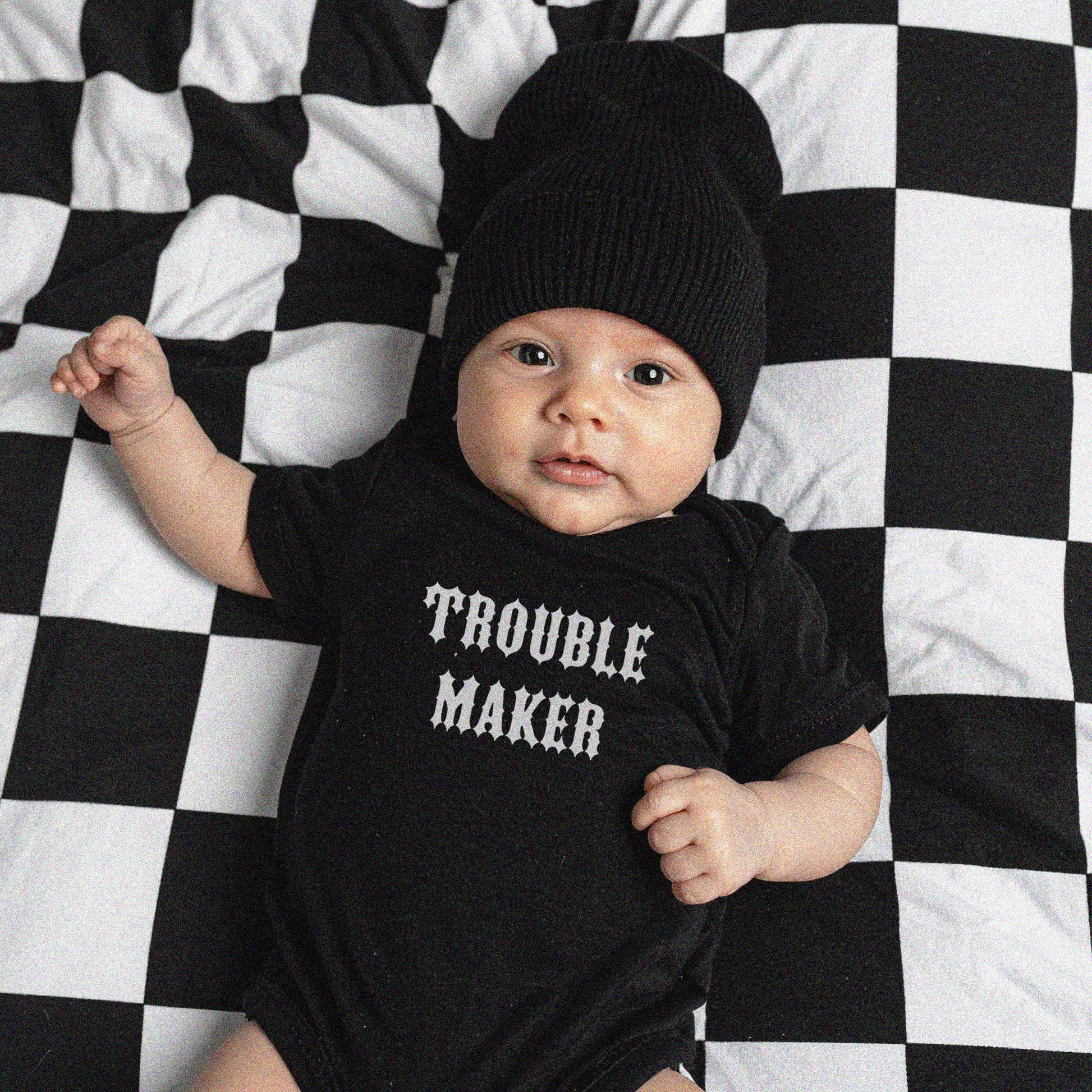 This Trouble Maker Bodysuit is perfect for the mischievous little ones in your life. With its double-needle ribbed binding and lap shoulder design, dressing your infant has never been easier. The innovative three-snap closure and rib knit fabric ensure comfort and durability. Made of 100% combed ringspun cotton, this bodysuit is lightweight and soft, perfect for everyday wear. Ideal for parents looking to add a touch of humor to their baby's wardrobe.