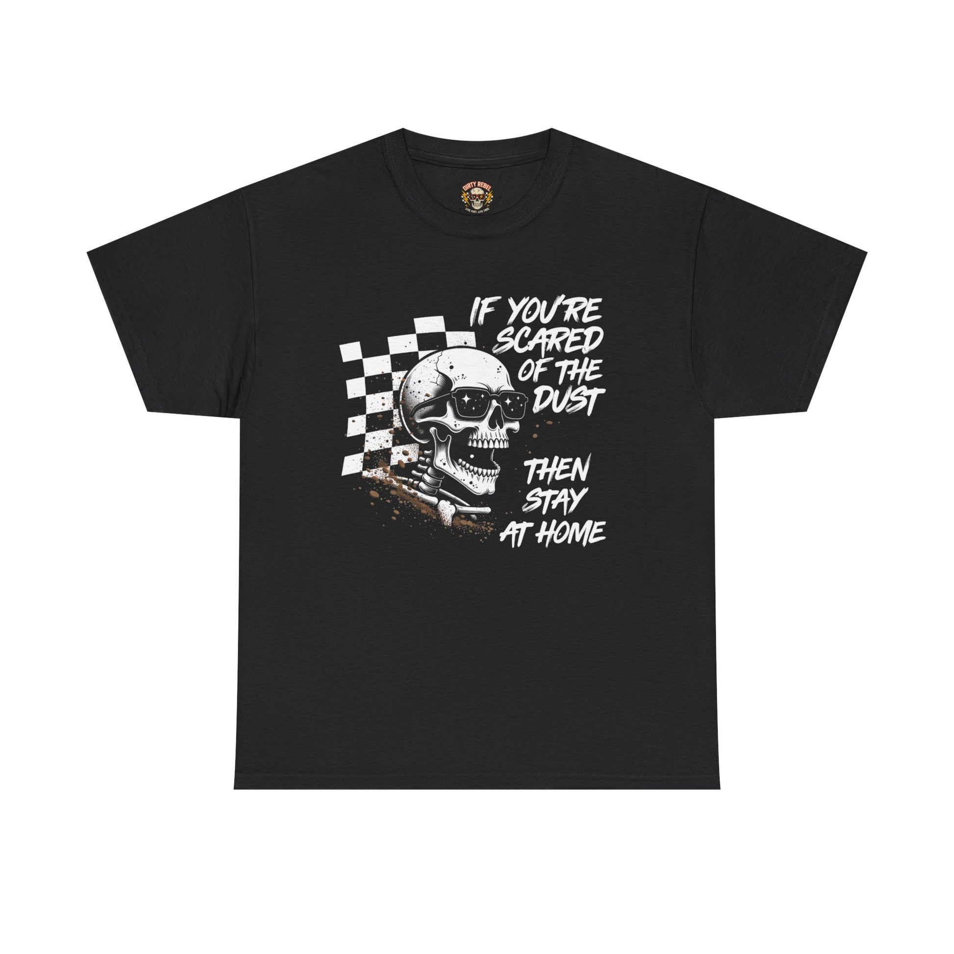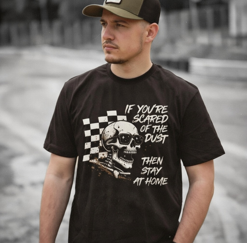 This heavyweight cotton tee brings a gritty, road-ready attitude to everyday wear. The bold front print—featuring a grinning skull, racing checkerboard and the defiant line “If you’re scared of the dust then stay at home”—carries a raw, vintage-inspired energy that fits into garage nights, track days, and backroad rides. Cut in a relaxed classic fit with a crew neckline and tear-away label, the shirt feels rugged without rubbing. Durable, smooth-knit fabric holds prints crisply, while shoulder twill and a seamless tubular body keep the shape through repeat wears. Wear it layered under a worn denim jacket or solo at a meet-up; it reads like a statement from someone who prefers grit over polish and stories over showroom shine.