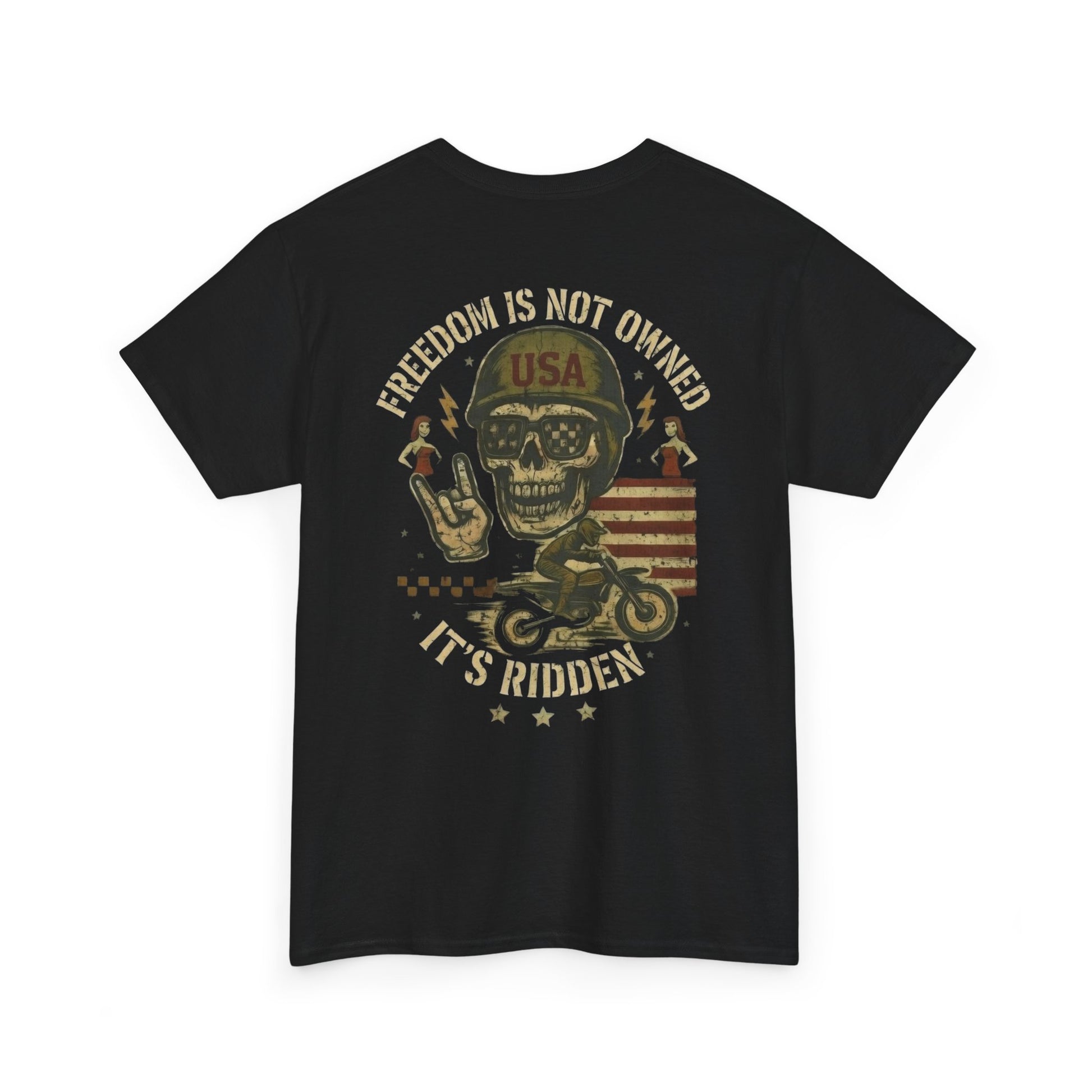 Take your style to the next level with our Freedom Ride Tee, an essential wardrobe piece for those who live life on the edge. This finely crafted tee embodies the spirit of Americana, echoing the essence of freedom and rebellion. The tee, punctuated with the reminder, 'Freedom is not owned. It's ridden', exhibits not just a passion for the open road, but a profound philosophical take on life. Made from durable, yet soft-on-skin fabric, it stands up to rough rides and tough times, while ensuring unparalleled comfort. Its eye-catching design inspired by the open roads of the USA, boldly sets you apart from the crowd. With this tee, you're not just wearing a piece of clothing, you're embracing a lifestyle.eed!