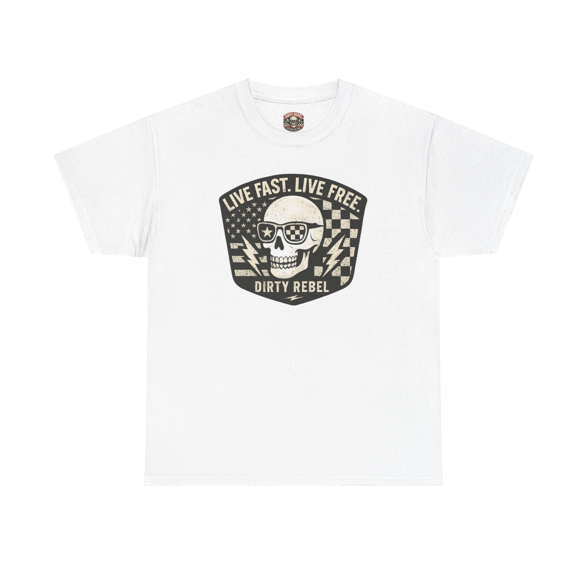 Unleash your inner speed demon with our 'LIVE FAST. LIVE FREE.' Skully Tee. This handcrafted T-shirt is an original Dirty Rebel design, made for those who are unafraid to live life in the fast lane. The bold print reflects a love for good times and a rebellious spirit. Its edgy design features an adrenaline-pumping racing theme, oozing with a sense of patriotism. Made from 100% high-quality cotton, this tee promises durability, comfort, and longevity. It's not just a clothing item but a statement piece that screams freedom. With its comfortable fit and edgy design, it’s an essential addition to any thrill-seeker's wardrobe.