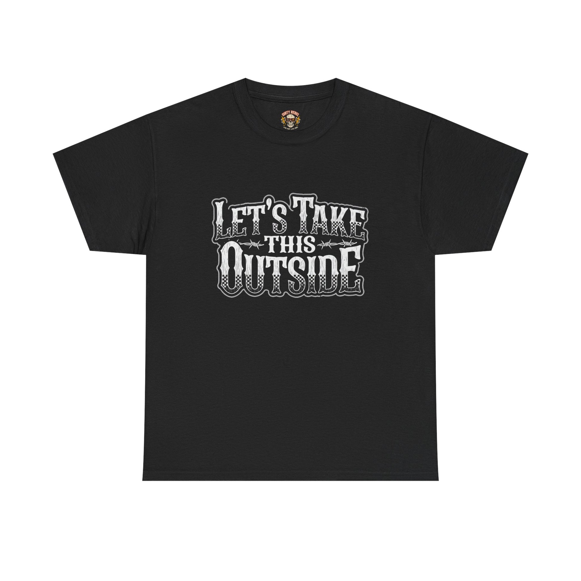 This relaxed crew-neck tee carries a bold, vintage-inspired statement across the chest: “Let’s Take This Outside.” It feels like a shout-out to open-air hangs, backyard barbecues, late-night porch talks, and spontaneous road trips. The soft, midweight cotton sits comfortably all day while the classic cut keeps things easy and unfussy. Worn with worn-in denim or layered under a flannel, it settles naturally into the rhythm of weekends and evenings under the sky. The distressed, letterpress-style lettering gives the design a lived-in character that matches the casual confidence of folks who prefer fresh air to small talk.