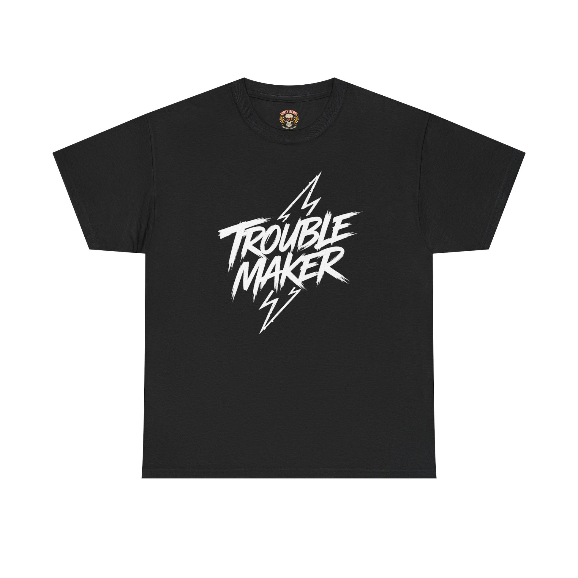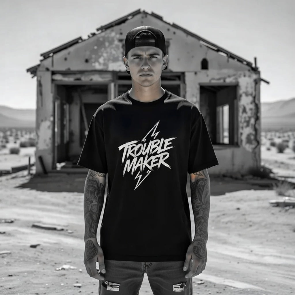 This black classic-fit tee carries a bold, hand-lettered “Trouble Maker” graphic framed by lightning bolts — a small rebellion you can wear every day. The medium-weight cotton feels substantial but breathable, with a ribbed crew neck that keeps its shape and a tear-away label for itch-free comfort. Tubular knit construction and taped shoulders give a clean silhouette that drapes well, while high-detail DTG/DTF printing keeps the white artwork crisp against the dark fabric. Wear it to skate sessions, late-night gigs, or casual hangs when you want your outfit to speak with a wink rather than words.