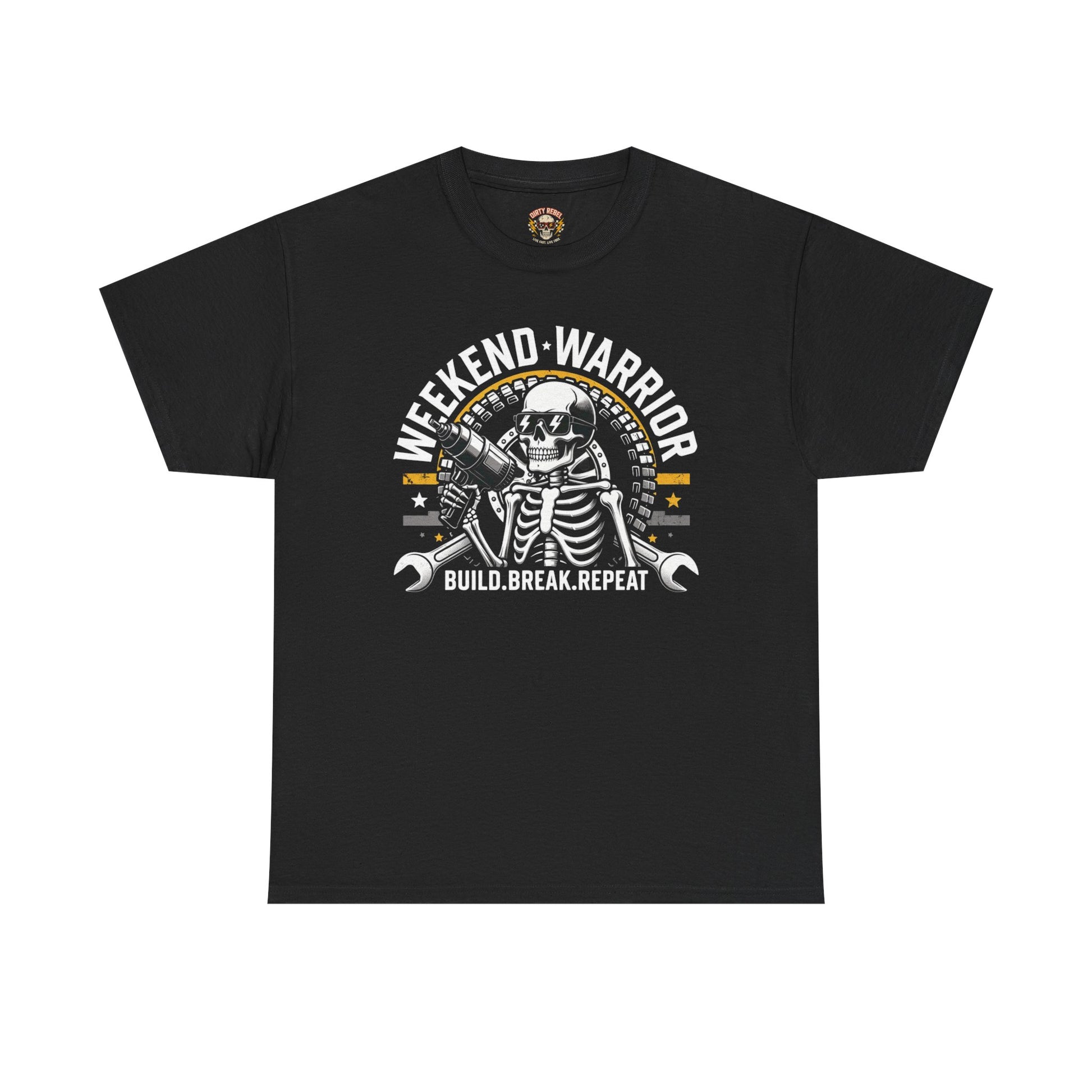 This tee wears like a close friend who shows up when you want to get things done. A bold skull-in-goggles graphic reads “Weekend Warrior — Build. Break. Repeat.”, speaking straight to hands-on makers who live for garage projects, late-night tinkering, and weekends lost in tools and elbow grease. The medium-weight cotton drape feels sturdy while staying breathable, and the classic crew cut layers easily under a flannel or work hoodie. Small, purposeful details — shoulder tape, ribbed collar, and a tear-away label — keep the fit stable and irritation-free through long sessions of work and play. The slightly vintage print contrasts on the black fabric, giving the design that lived-in, workshop badge look that melds with greasy hands and proud scars.