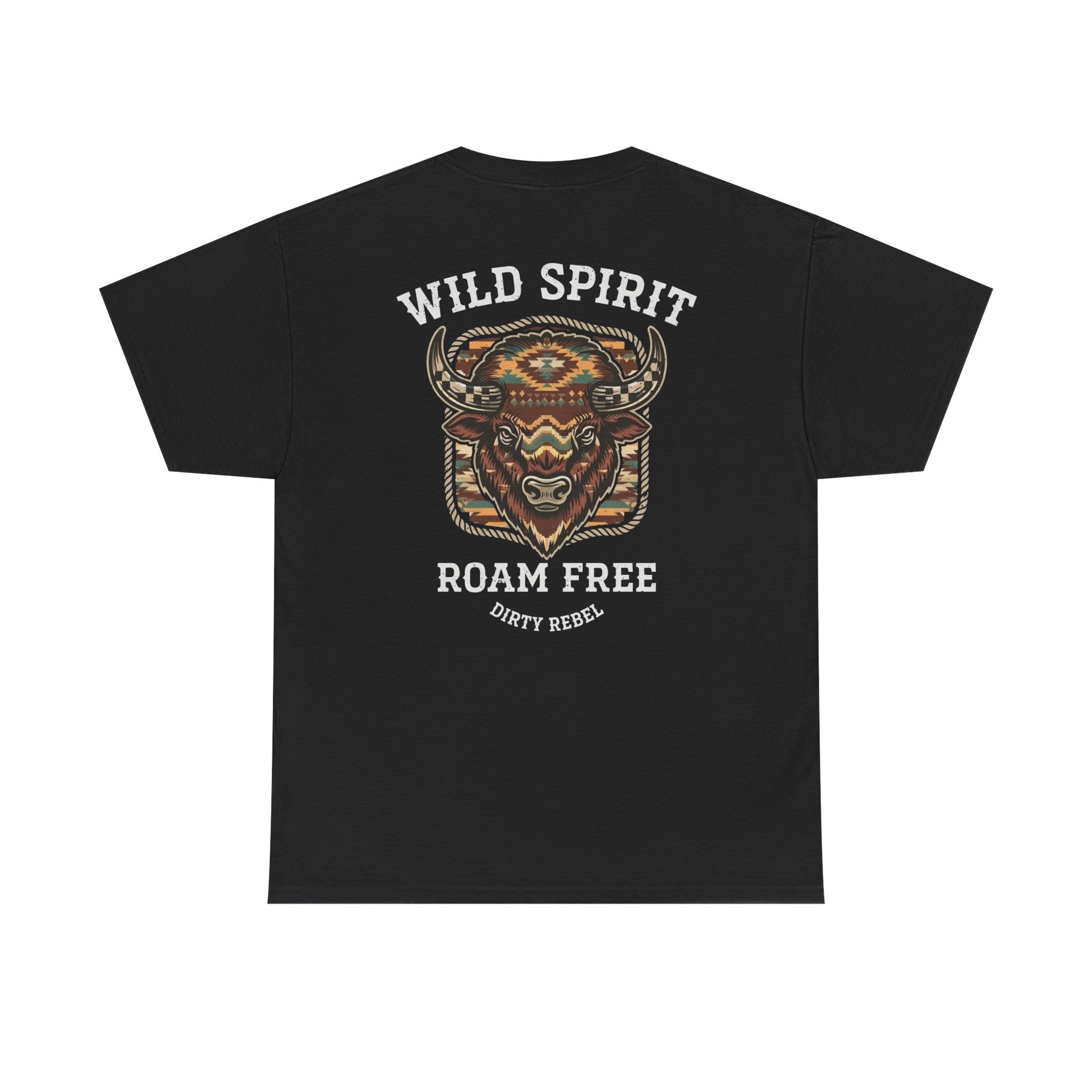 This classic crew-neck tee carries a rugged, road-ready vibe — a compact chest graphic up front and a bold, patterned bull motif across the back framed by the words “WILD SPIRIT” and “ROAM FREE.” The muted, earthy palette and woven-pattern detailing give the design a hand-crafted, southwestern feel that sits comfortably between vintage band merch and modern outdoor wear. Wear it on long drives, at small gatherings by the fire, or while scouting dirt roads and weekend trails; it layers easily under a flannel or wears alone with worn jeans. The result is a breathable, durable shirt that looks broken-in from day one but keeps its shape and print clarity through repeated washes.