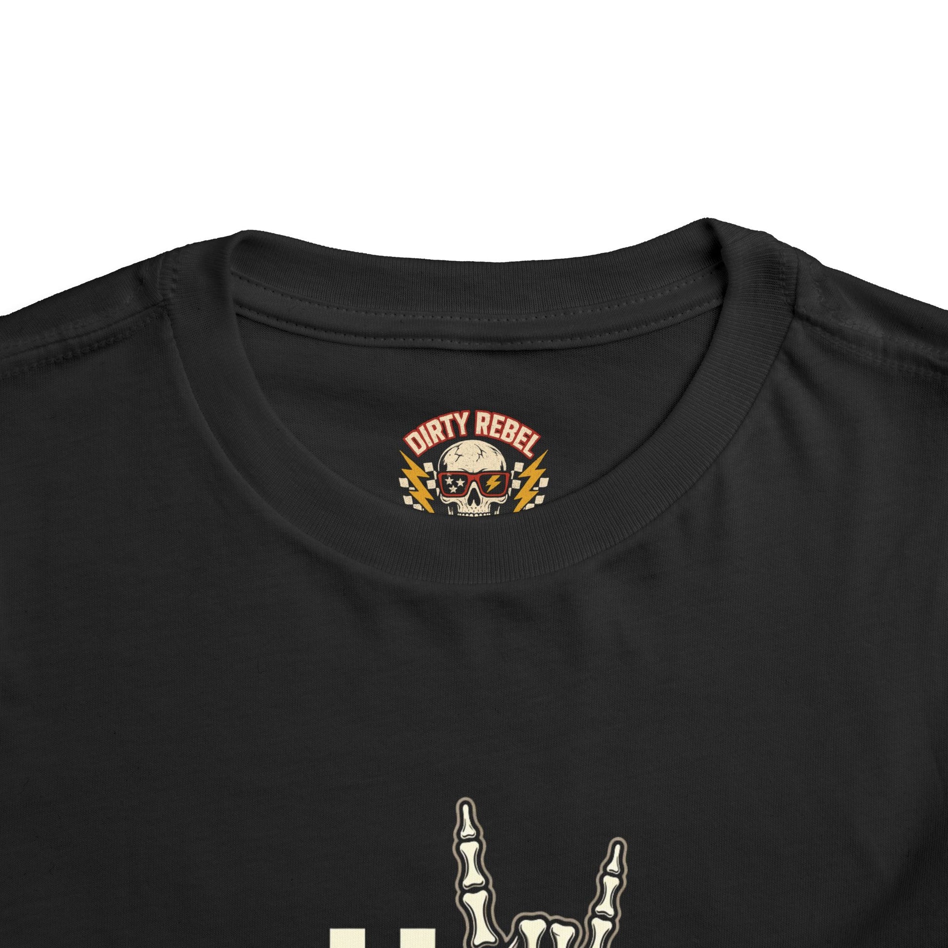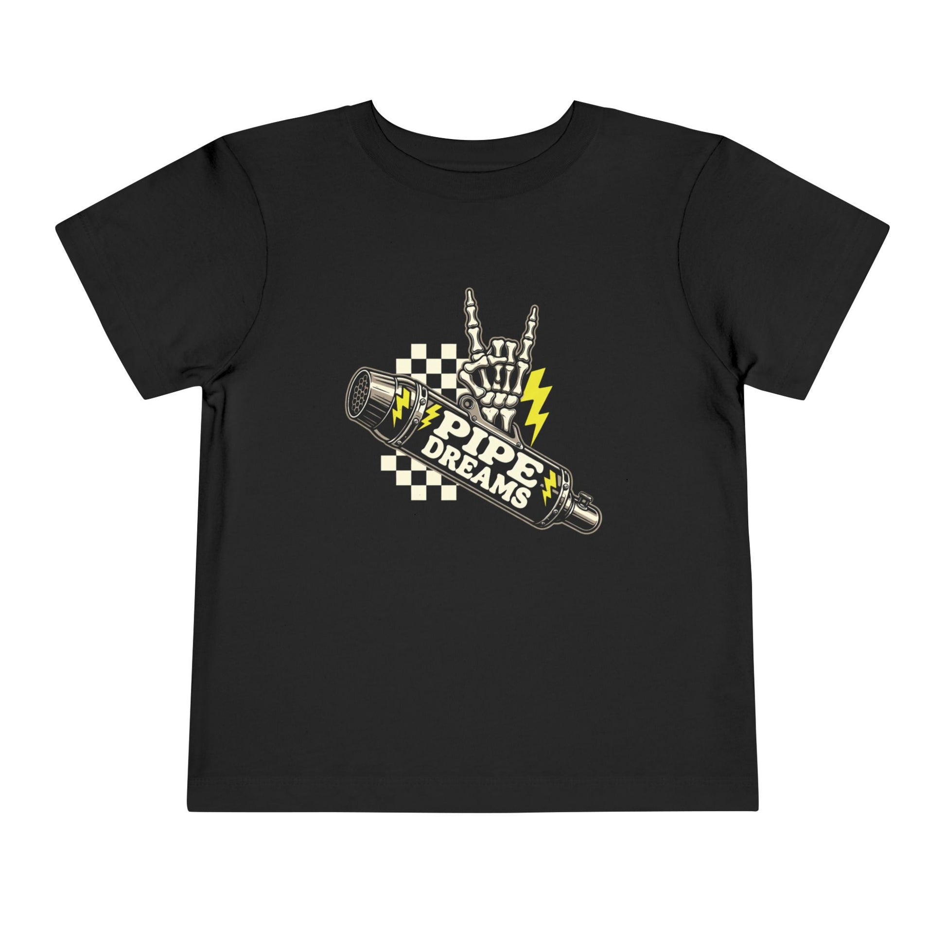 Little racetrack rebel. This toddler tee brings high-energy garage style to tiny wardrobes — a bold muffler graphic, checkered flag background, and electric-yellow accents that read loud on black cotton. It feels light and breathable for playtime, naptime, and runs around the block. The slim, structured silhouette from the side seams keeps the print centered and tidy, while the tear-away label spares sensitive necks. Slip it on when you want a confident, road-ready look for a kiddo who’s already revving up curiosity and adventure.