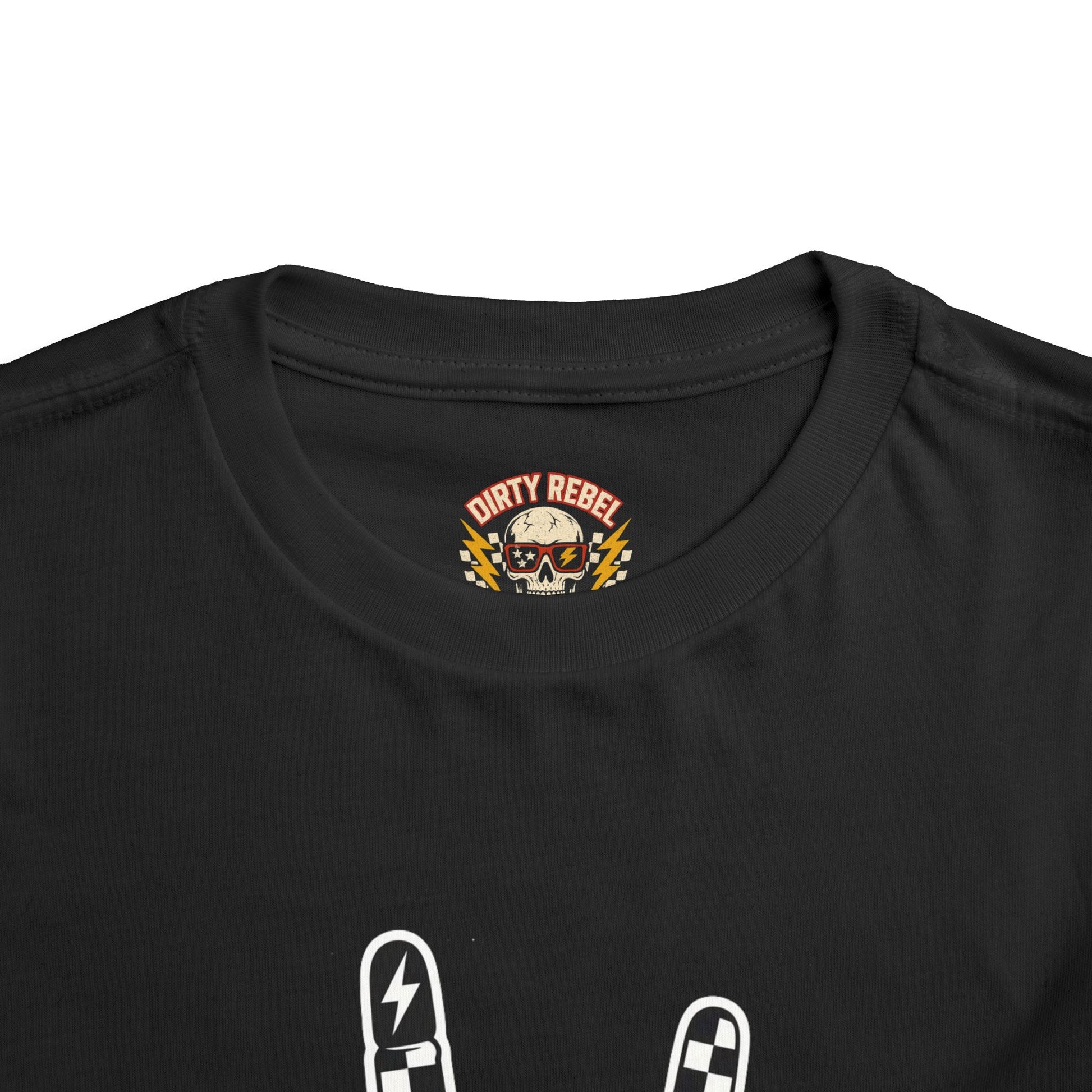 This soft, lightweight toddler tee brings little rebels’ energy into everyday play. A bold, hand-drawn “rock on” hand graphic sits center chest in high-contrast white on black, giving a playful punk attitude without being loud. The fabric breathes and moves with tiny bodies—great for backyard moshing (aka running), playground climbs, and cozy couch concerts. The tear-away label keeps comfort irritation-free for sensitive skin, and the side seams hold the tee’s shape through many washes. Layer under a zip hoodie or pair with mini denim for a look that says ‘tiny but mighty.’