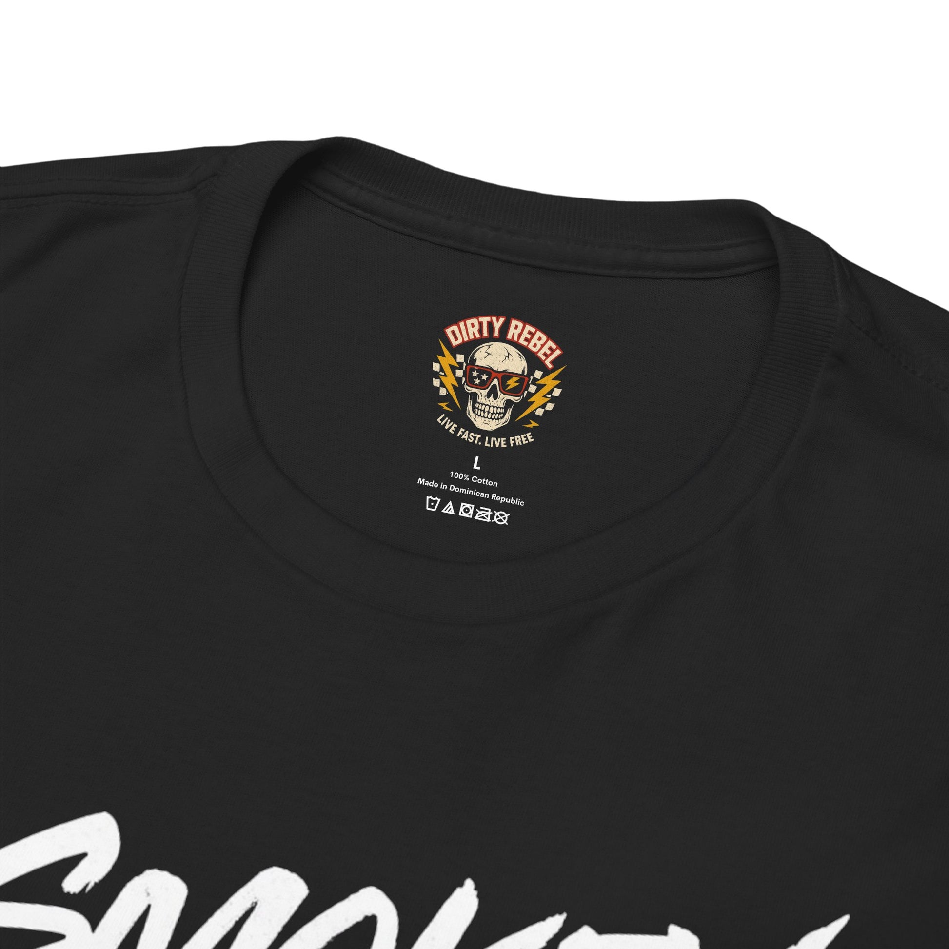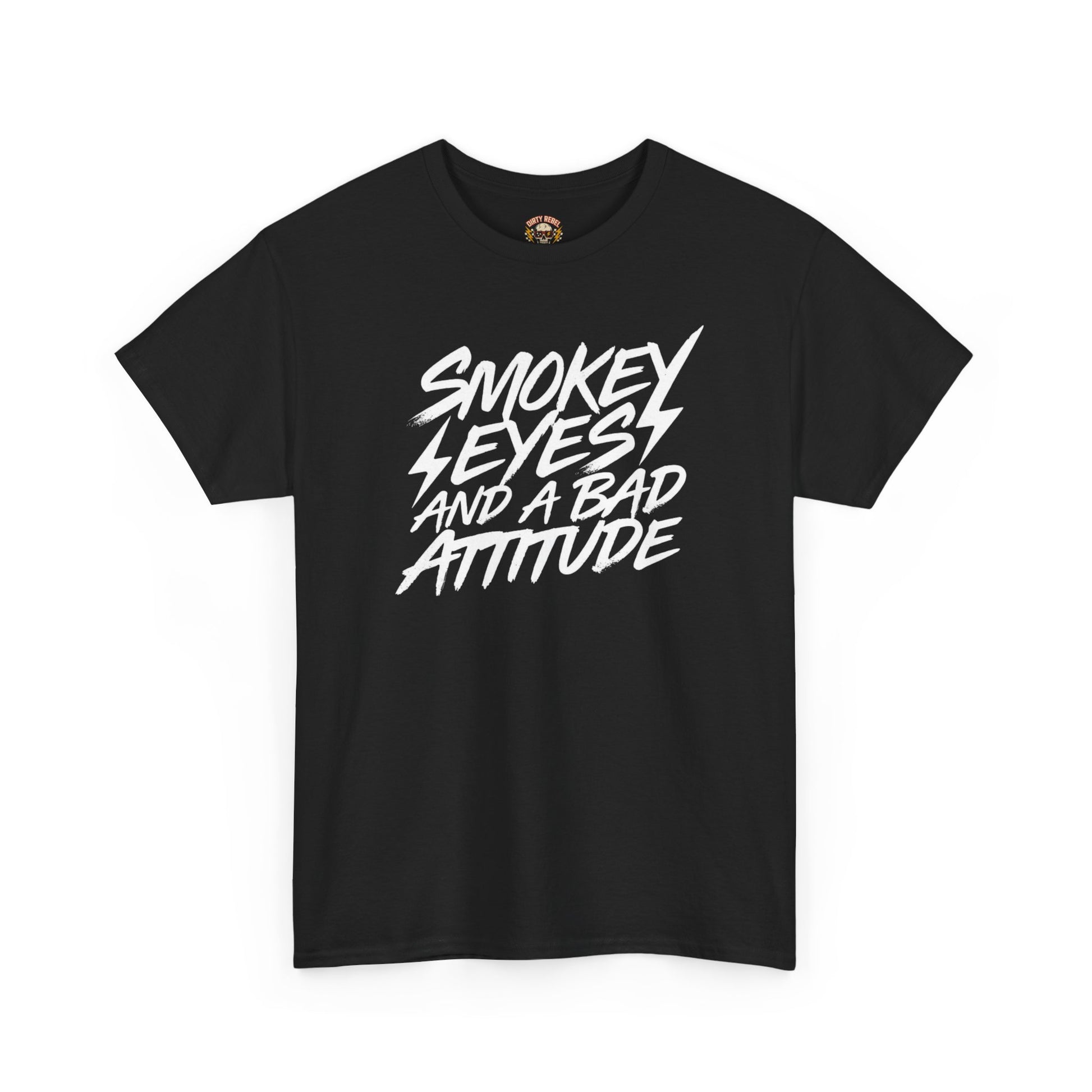 A bold, streetwise tee made to speak up before you do. This classic crew neck shirt carries a gritty hand-lettered slogan—'Smokey Eyes and a Bad Attitude'—that reads like a wink and a dare. The relaxed, midweight cotton feels substantial without weighing you down; the ribbed collar and shoulder tape keep the silhouette crisp wash after wash. Wear it with a leather jacket, high-waisted denim, or layered under an open flannel to add an edge to city nights, late-show hangouts, or whenever you want your outfit to match your mood.