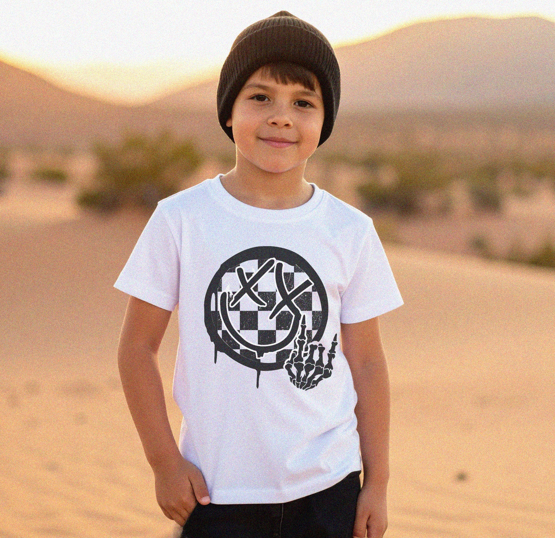Get ready to wow your young ones with this unique Punk Checker Smiley Tee. A show-stopper in its own right, the tee features a playful yet rebellious smiley design, crafted to express their fun-loving yet fiercely independent spirit. Created as part of the esteemed Dirty Rebel collection, this top-quality tee is a testament to outstanding artistry and design. Manufactured with the finest cotton fabric, it promises soft, comfortable, and durable wear for your youngsters. The vibrant smiley design coupled with a contemporary checker pattern is sure to add an exciting twist to their daily outfits. The unusual design also makes it an excellent conversation starter. Remember, a true rebel doesn't follow the crowd but creates their path. Let this Punk Checker Smiley Tee be their first step rebellion.